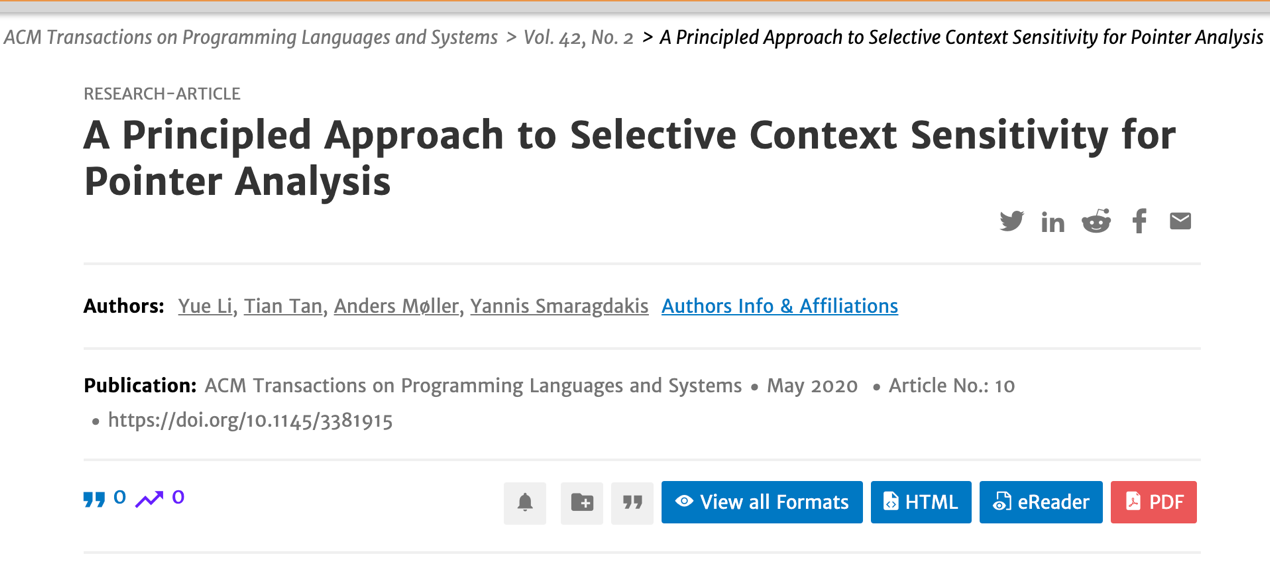 该成果在2020年5月20日,以“A Principled Approach to Selective Context Sensitivity for Pointer Analysis”为题发表于《ACM Transactions on Programming Languages and Systems》期刊上(TOPLAS 42(2)),玩偶姐姐 为第一及通讯单位,李樾为第一作者,谭添为通讯作者,丹麦奥胡斯大学Anders Møller教授、希腊雅典大学Yannis Smaragdakis教授为合作者。TOPLAS是程序设计语言领域的顶级国际期刊,也是CCF推荐A类期刊。该论文是TOPLAS自1979年创刊41年来,玩偶姐姐 首次、我国内地高校和科研机构第三次(近五年唯一)以第一单位名义发表的科研成果。