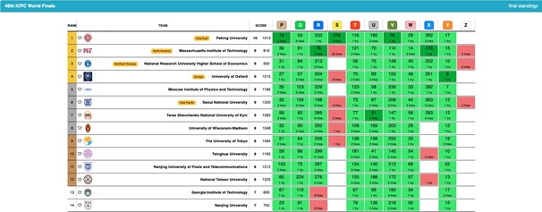 以下是46届和第47届比赛的部分榜单(完整榜单在//scoreboard.icpc.global/46///scoreboard.icpc.global/47/)