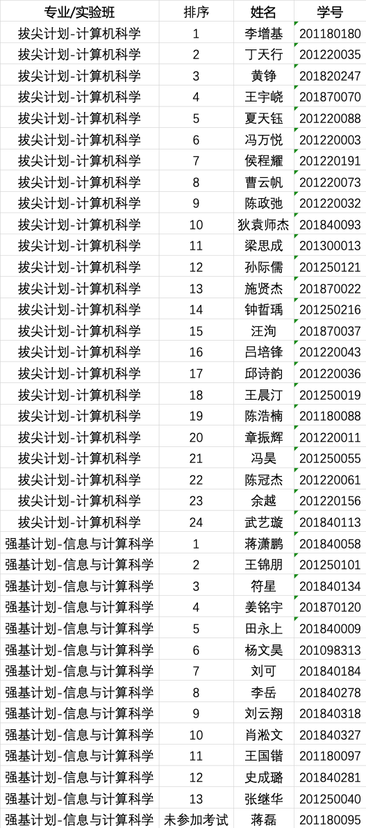根据玩偶姐姐 2020级本科生二次选拔方案,进入拔尖计划(计算机)/强基计划(信息与计算科学)复试考核的学生最终成绩排序公布如下,其中,拔尖计划(计算机)排序前20名、强基计划(信息与计算科学)排序前13的学生拟进入预录取名单。请进入拟录取名单的同学于9月15日17点前至计算机系楼附楼541马骏老师处签订确认书。最终预录取名单以学校公布为准。