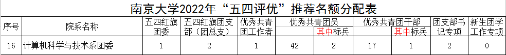 5、优秀共青团干部及标兵(共17个推荐名额,含标兵1个):(1)本科18级、19级各3人,20级4人,共计10人;(2)研究生(含硕士、博士)共计2人;(3)学生会2人【注意:团委学生会产生候选人之后请及时告知候选人所在年级总支以免重复推荐】;(4)研究生会2人【注意:研究生会产生候选人之后请及时告知候选人所在总支、支部以免重复推荐】;(5)系青协1人【注意:系青协产生候选人之后请及时告知候选人所在总支、支部以免重复推荐】。(若支部、团学组织无合适人选,则名额收回统一分配。)