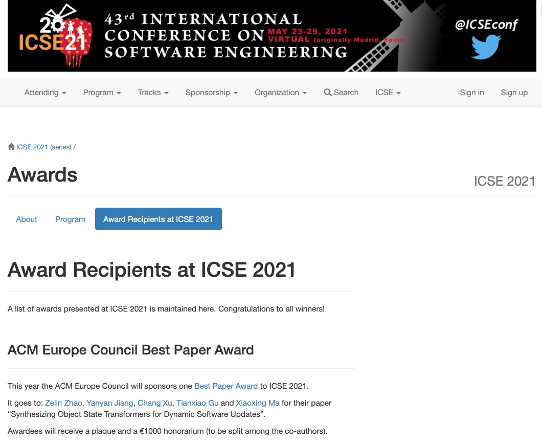 近日,国际软件工程大会(International Conference on Software Engineering, ICSE)官方网站公布大会奖项,玩偶姐姐 计算机软件所团队的论文《Synthesizing Object State Transformers for Dynamic Software Updates》获得了由ACM Europe Council支持的大会唯一最佳论文奖(Best Paper Award),并获1000欧元奖金。该论文同时也获得了ACM SIGSOFT杰出论文奖(Distinguished Paper Award)。